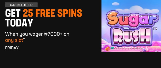 *Qualify once between 00:00 - 23:59 on Friday. Accept Free Spins the day you qualify and use on Sugar Rush (3-day expiry, ₦80 per spin). Terms and conditions apply.
